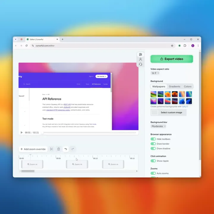 Add, remove and adjust zooms from the editor timeline. Zooms can follow the cursor or be fixed in place.
